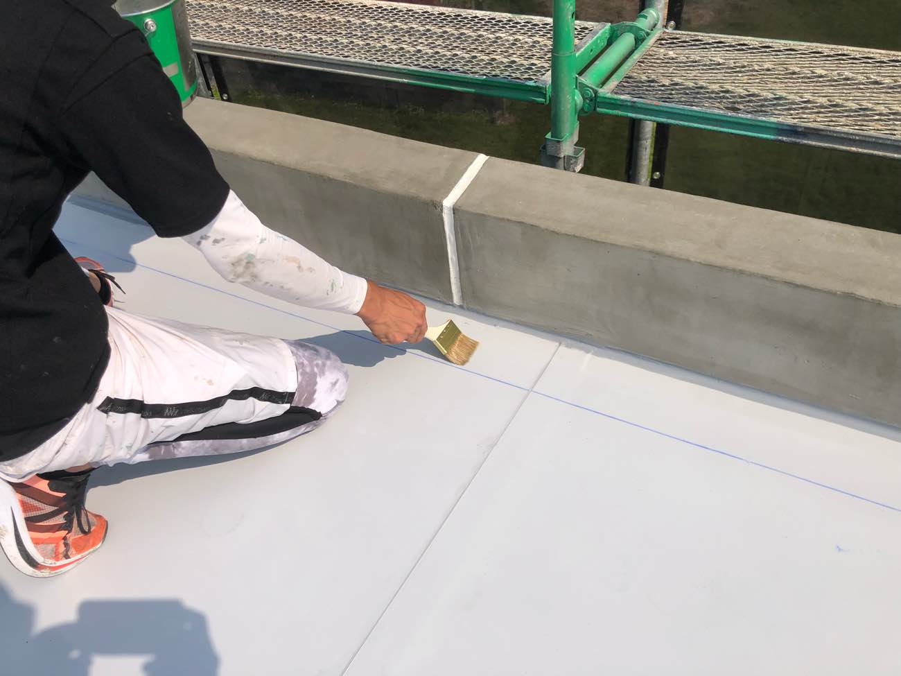 塩ビシート防水(平場)やウレタン防水(立上り)の施工が完了したら、最後に行うのが トップコート塗布 です。トップコートは“ただの仕上げ塗装”ではなく、防水層の耐久性を保つために欠かせない保護膜 です。