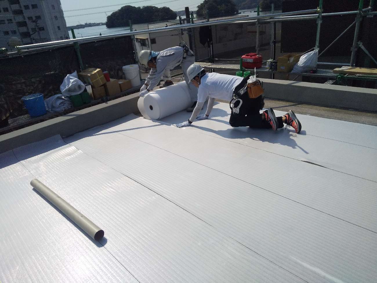 下地補修、緩衝材敷設、金具による押さえが整ったら、いよいよ 塩ビシート を屋上全体に敷いていくメイン工程に入ります。