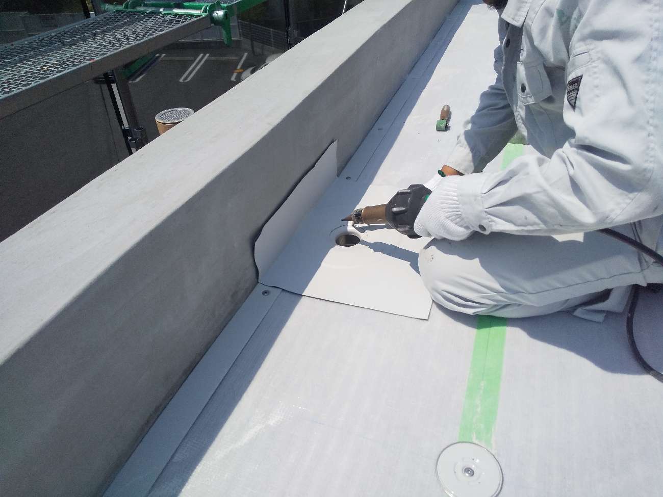 合成高分子ルーフィング(塩ビシート防水)+塗膜防水の立ち上がり処理で新たに防水層を作る工事を行います。