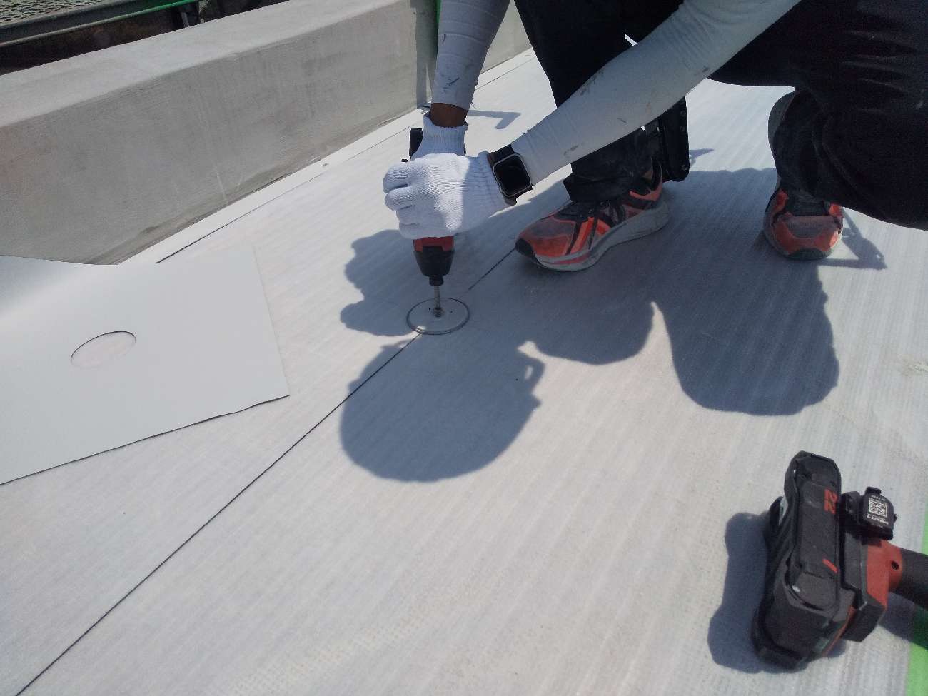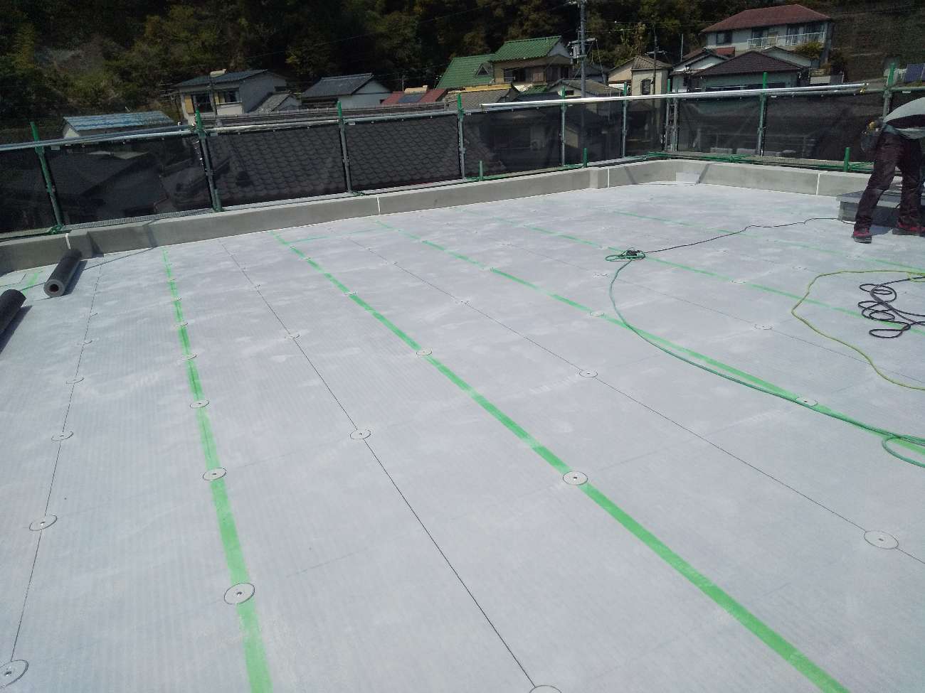 この工程は、後に敷く「塩ビ防水シート」をしっかりと固定するための“骨組みづくり” のような役割を持っています。